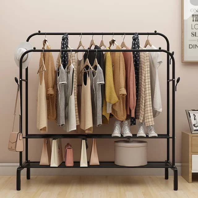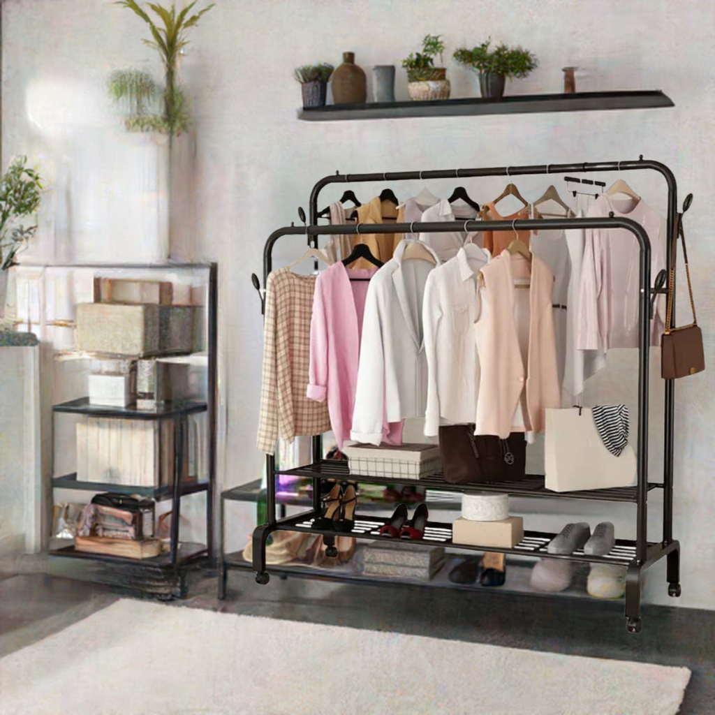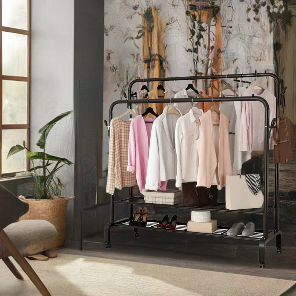 Optimisez votre espace avec le Portant VIP, un indispensable pour organiser vos vêtements avec style et efficacité. Conçu avec une double barre de suspension, il permet d’accrocher un maximum d’habits sans encombrer votre pièce. Que ce soit pour vos vestes, chemises, robes ou pantalons, ce portant assure un rangement soigné et accessible. Son design moderne en métal noir s’adapte parfaitement à tous types d’intérieurs, apportant une touche à la fois élégante et fonctionnelle.